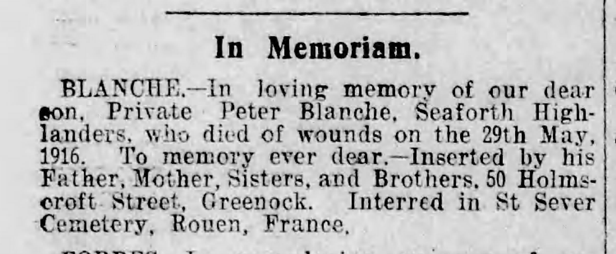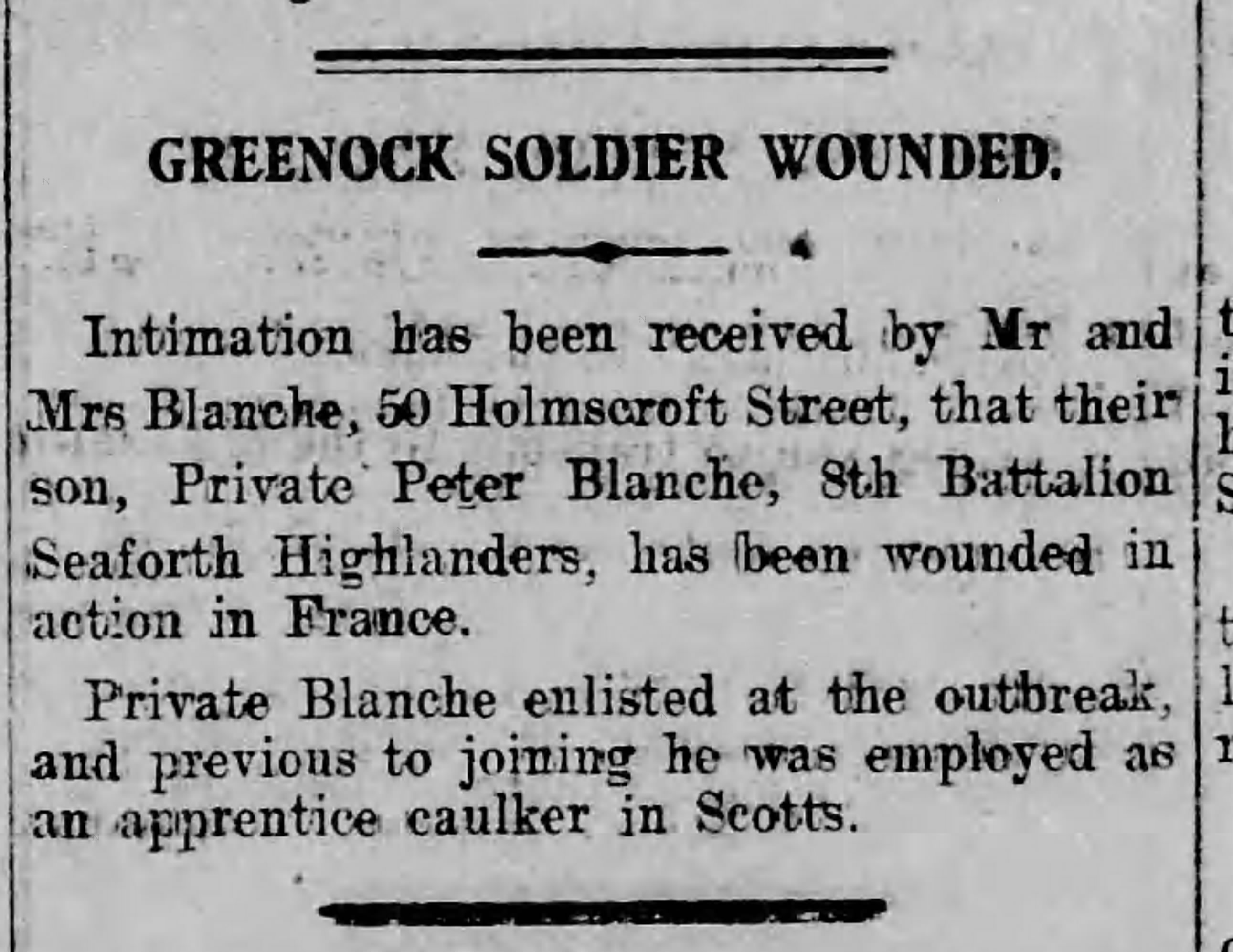SON OF THOMAS BLANCHE, OF 50 HOLMSCROFT ST., GREENOCK. Apprentice Caulker with Scotts