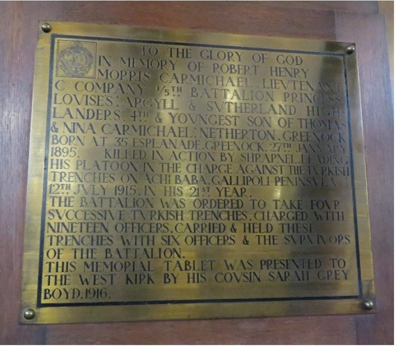 To the glory of God In memory of Robert Henry Morris Carmichael Lieutenant C Company 1/5th Battalion Princess Louise's Argyll & Sutherland Highlanders 4th and youngest son of Thomas and Nina Carmichael, Netherton, Greenock. Born at 35 Esplanade, Greenock 27th January 1895. Killed in action by shrapnel leading his platoon in the charge against the Turkish trenches on Achi Baba, Gallipoli Peninsula, 12 July 1915 in his 21st year. The Battalion was ordered to take four successive Turkish trenches. Charged with nineteen officers. Carried and held these trenches with six officers and the survivors of the Battalion. This memorial tablet was presented to the West Kirk by his cousin Sarah Grey Boyd, 1916